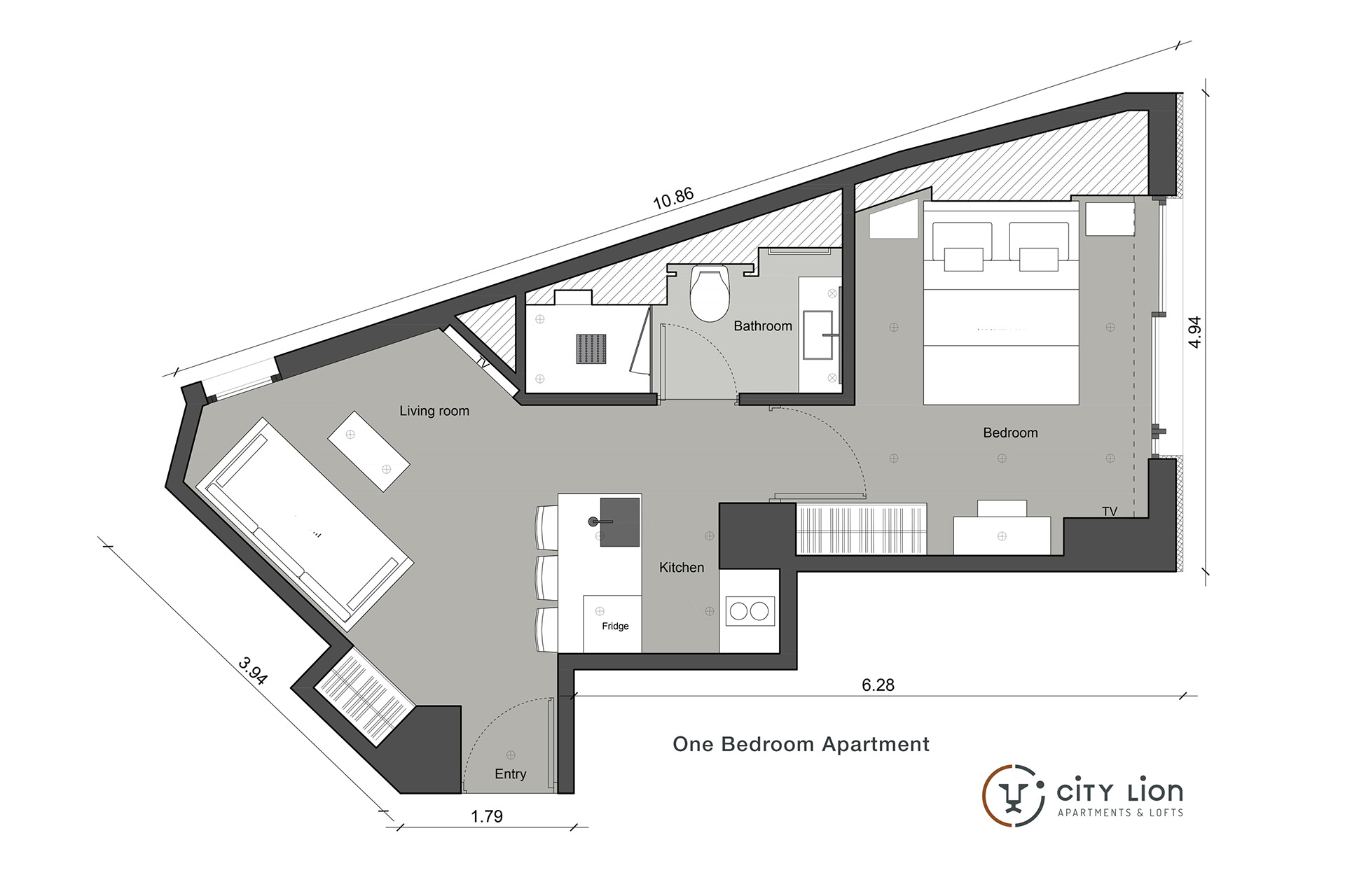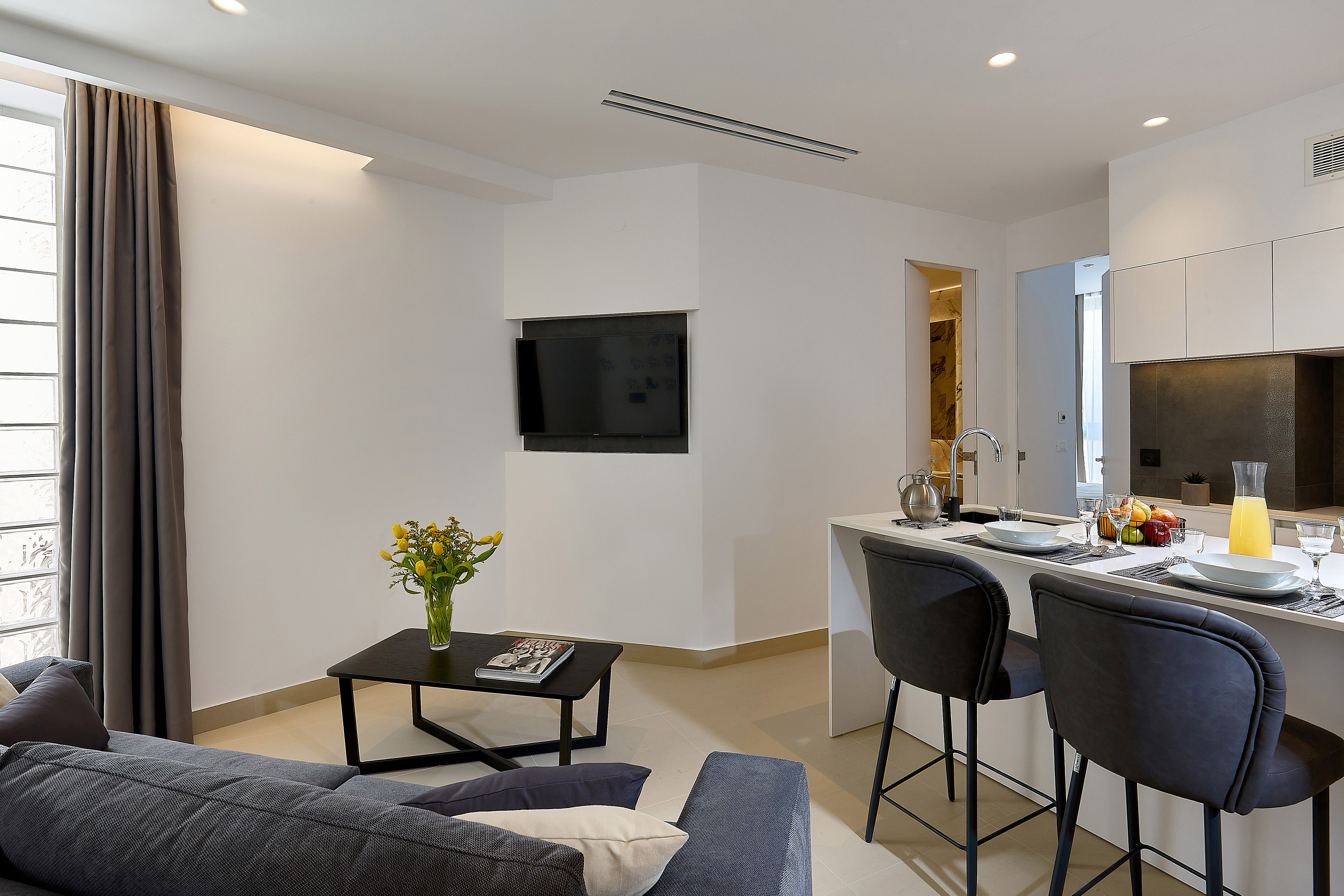 The One Bedroom Apartments of 42 sq.m offer a comfortable living environment. They have a bedroom with a double bed and a single space with a fully equipped kitchen, dining area / island and a living room with a comfortable sofa that can accommodate a third person, as well as a bathroom.
